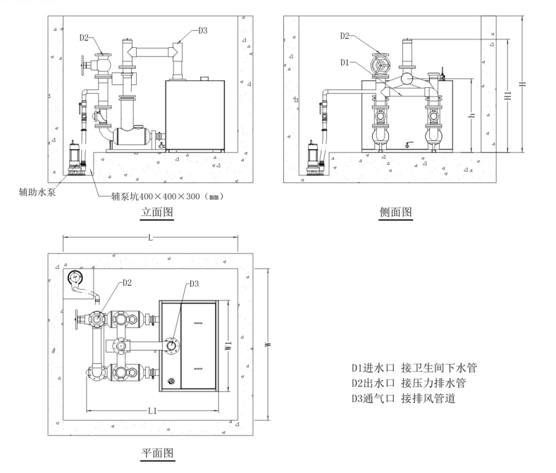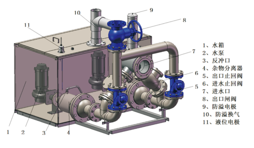 进水口DNmm | 出水口DNmm | 通气口DNmm | 水箱容积L | 设备尺寸L×W×H/m | 预制基座尺寸L×W×H/m |